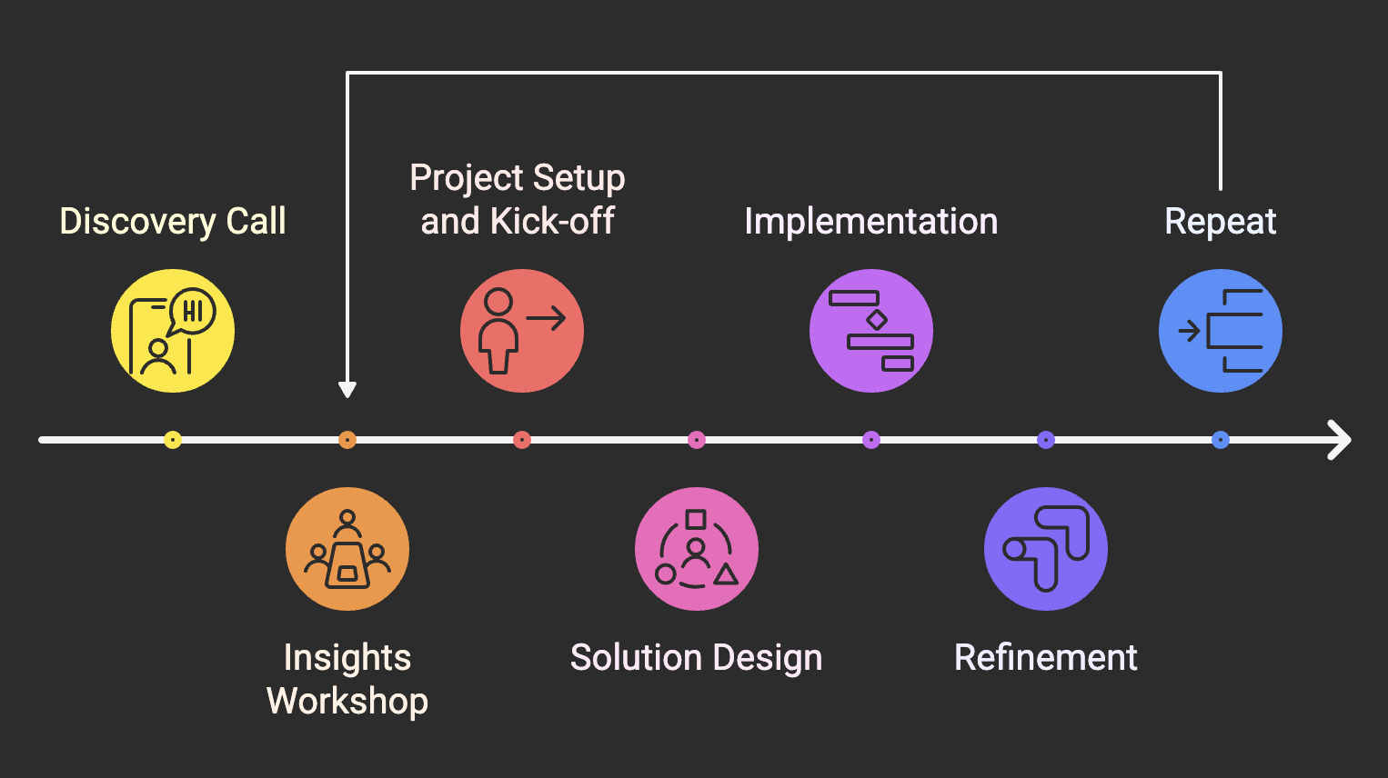 Timeframes in the stages below will depend on scope, complexity and your team's availability. We work in small, quick iterations to deliver value rapidly.